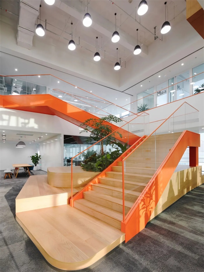 高层部分的两个体块分别布置了两组办公单元,为企查查不同的工作团队提供相对独立的办公空间。两组单元在平面空间上的些许错位使得整个建筑更具有辨识度与趣味性,在功能与形式上也形成了一种默契。