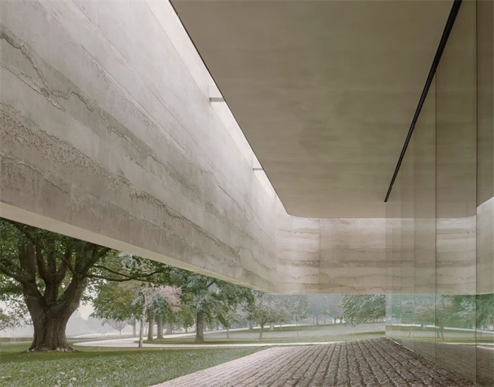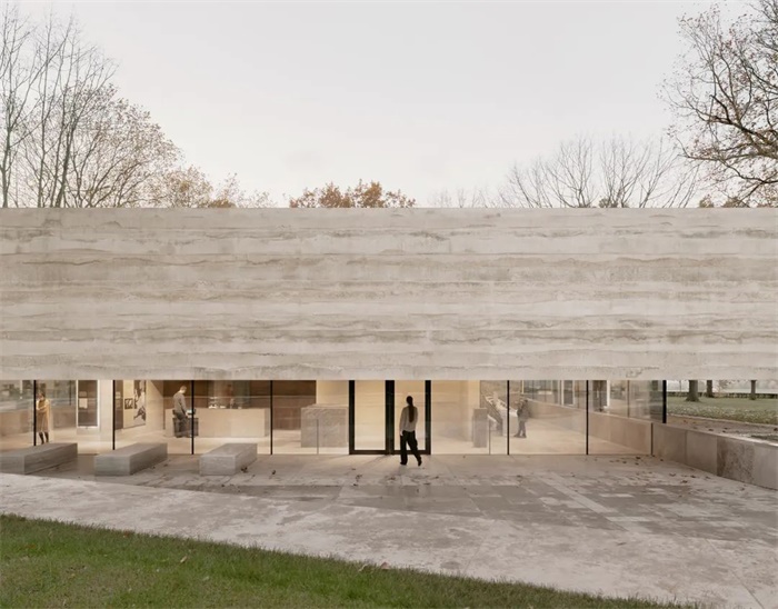 建筑坐落在外墙的框架内,下沉到倾斜的地形中,地面低于地面。玻璃墙提供了一个独特的全景视角,游客可以从较低的视角欣赏周围典型的地形和零星的树木。