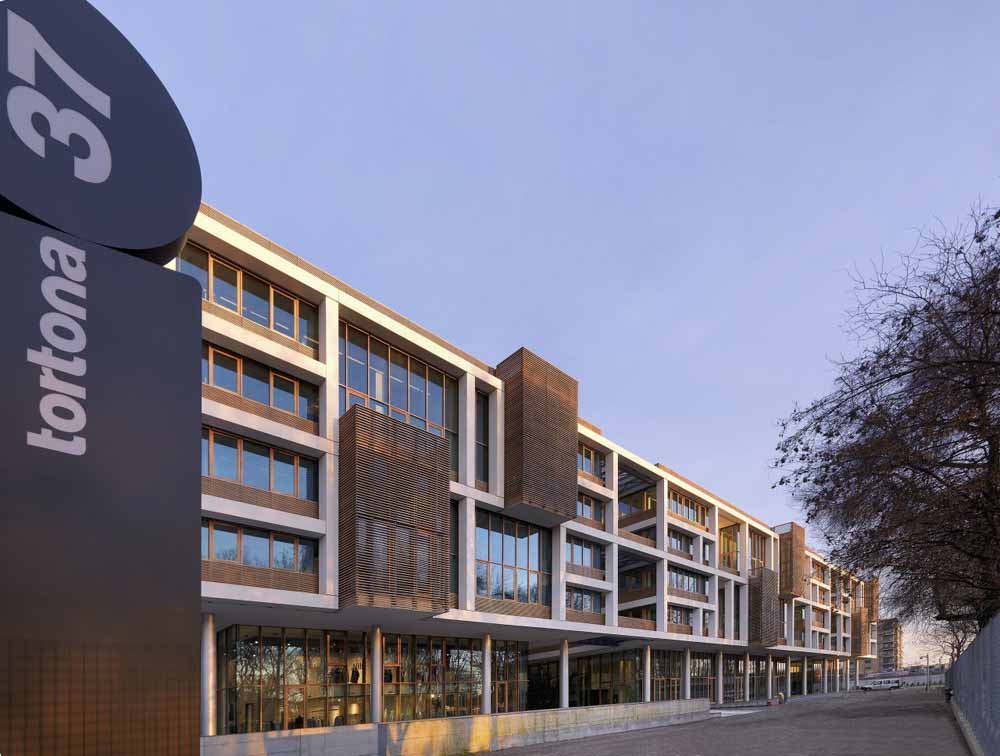 Tortona 37位于意大利米兰,是一个混合功能建筑综合体,包括围绕中央花园的五座大楼。每座矩形大楼均为6层,拥有南北两侧采光。空间层高7米,设置了内部夹层,实现了使用的灵活多边性。综合体内部容纳了展示厅、实验室、专业工作室、商店、办公空间,各自采用了定制设计:高度灵活的空间随时间推移可以一直保持可持续性。整个综合体立面的玻璃窗外悬挂了白色的栅格,达到建筑顶部时,形成了宽敞的露台,如同城市广场,员工来到这里,可以欣赏广阔的景观。项目的每个设计旨在实现最高的能源效率,巧妙协调建筑设计和工程之间的关系,包括配合地热线路使用的中央空调系统和室内的供暖壁板。