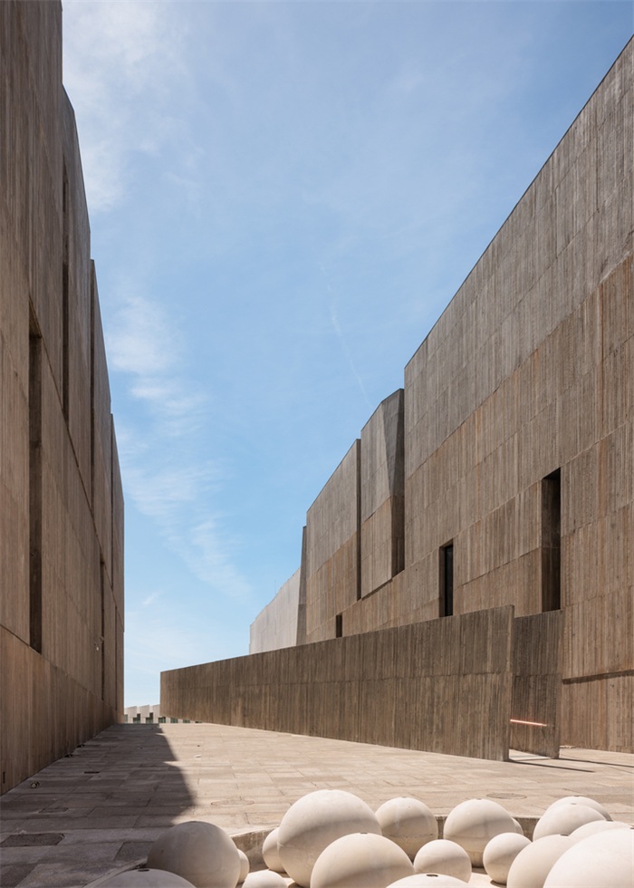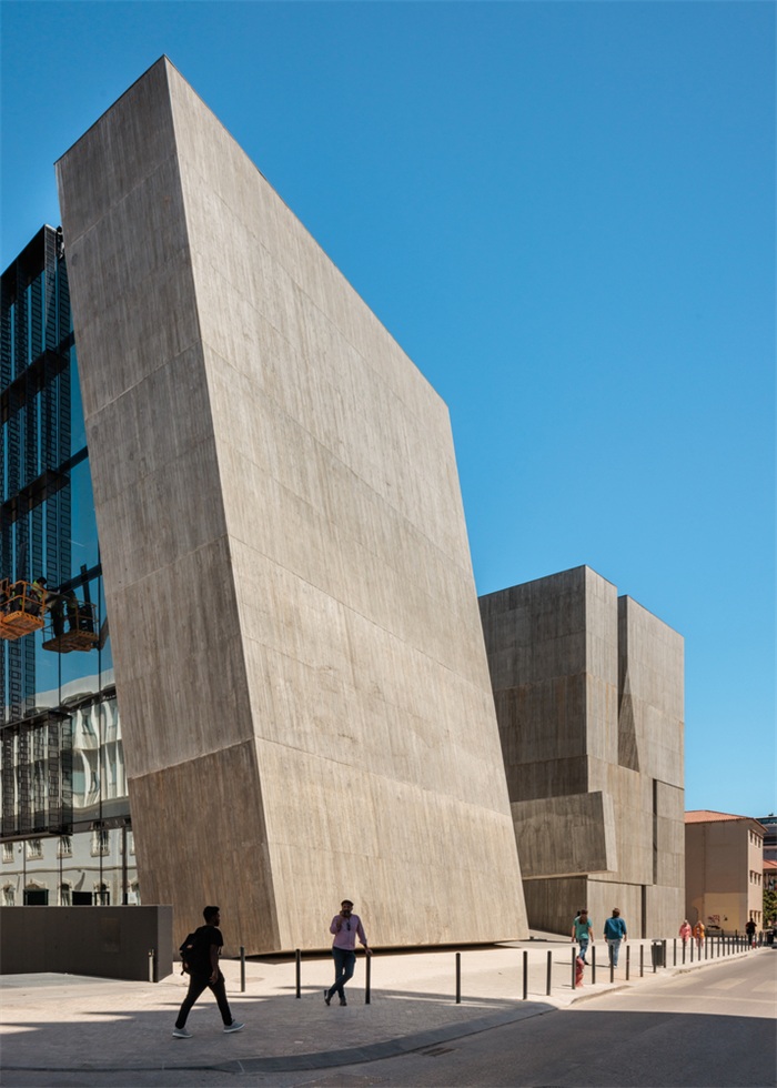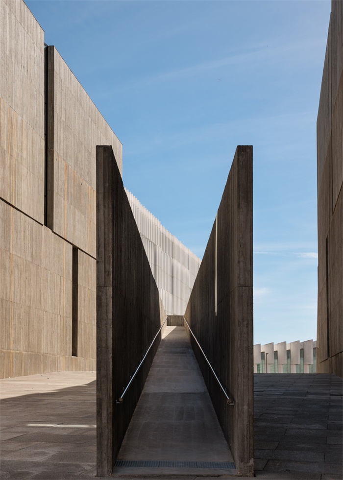 这个人工坡地还解决了地块的另一个问题:由于项目位于里斯本城市网格的第二排,朝向河流的视觉连续性更多停留在理论层面,而非现实层面。街对面的EDP总部大楼,虽然在总体体量上满足了南北方向的连续性,但在行人视角上却阻挡了人对河流的感知。因此,我们在坡地上架起一块混凝土结构,向河流方向悬挑延伸,其高度足以越过相邻建筑,人们便能获得眺望塔霍河的清晰视野。