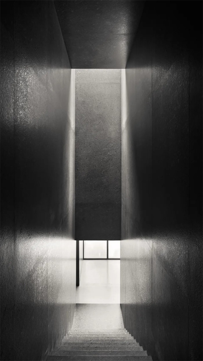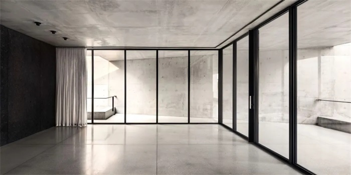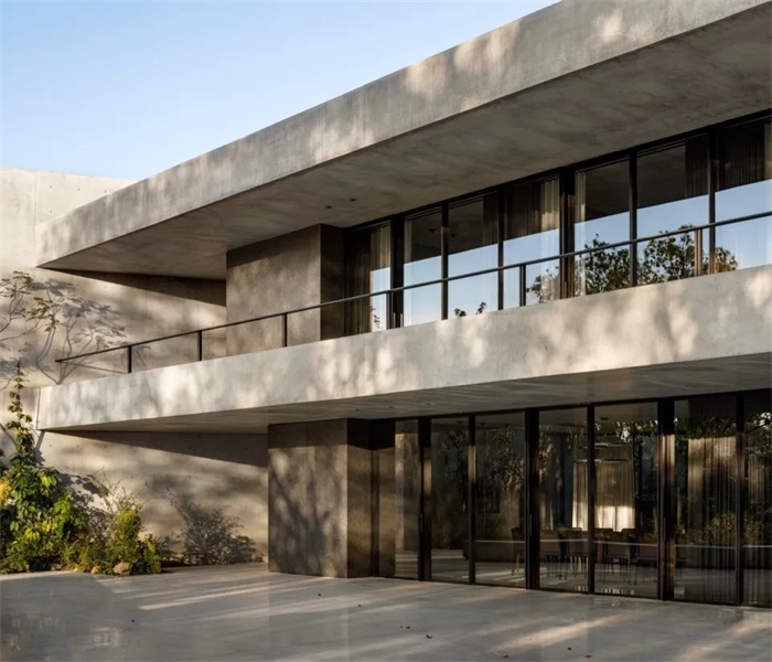 建筑内外均采用浅灰色的水磨石地面。两块混凝土板横跨整个空间,由黑色花岗岩体块支撑,体块中容纳了服务性空间。从入口庭院穿过住宅到达下方花园的小路,植被遍布其中。