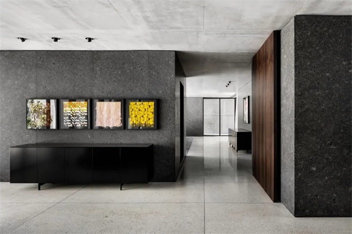 公共生活区位于花岗岩体块之间,能够持续性地与室外空间保持视觉上的连通。大型桉木吊门可调节每个空间的私密程度。