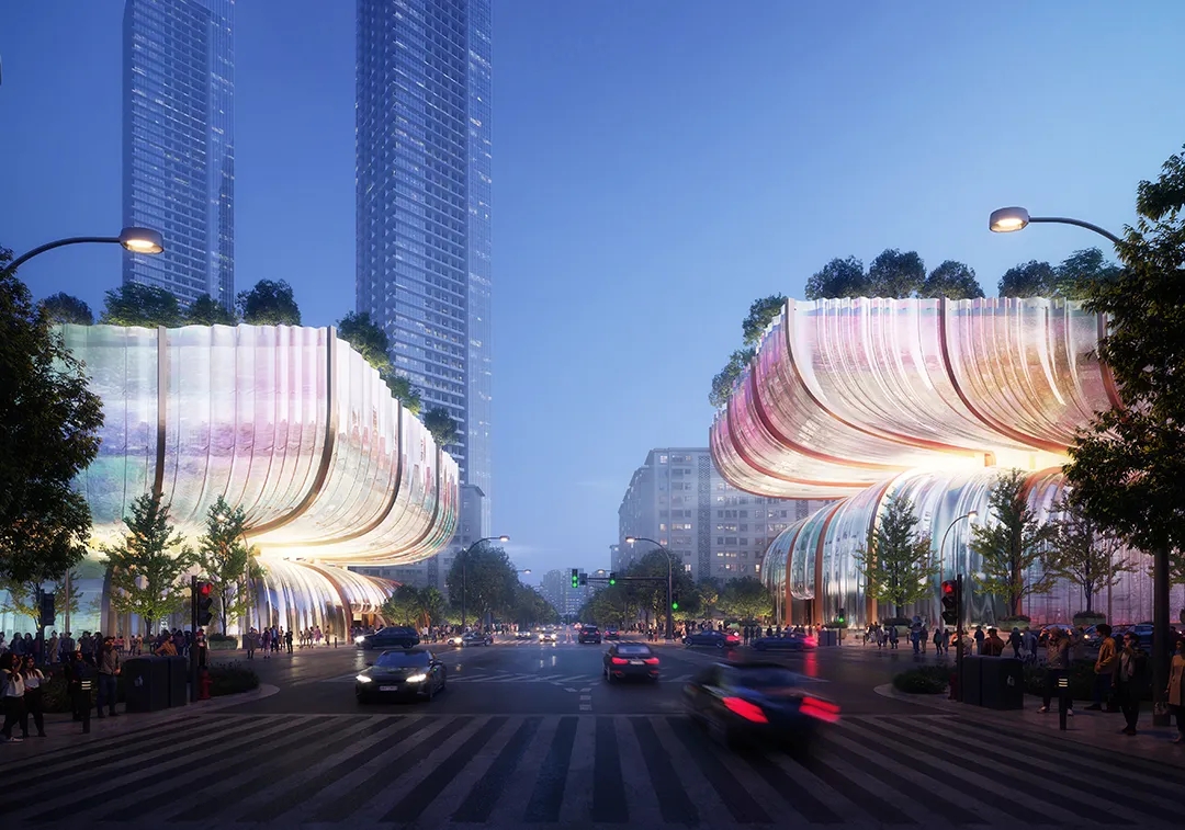 该购物中心由两座隔街对称布置的建筑组成,它们相似但不完全相同,通过一条地下通道连接在一起。从外观上看,它们地上部分的轮廓如同表面带有波纹的沙漏,而在内部,“沙漏”中间的颈部是充满自然气息的公共空间。在地面层,当人们站在两座建筑之间望向汉江时,这对醒目独特的双子楼共同构成了一个画框,将江景纳入。