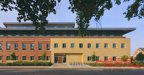 这座名为商业教学设施(Business Instructional Facility)的建筑恰如其名地主要用于商业教育教学。教学楼总占地面积16.3万平方英尺,被3幢长条形楼体围成一个4层高U形建筑,幕墙采用了本地砖和天然石材。这座U形建筑坐北朝南,环围形成了一个占地9000平方英尺的中庭和花园。