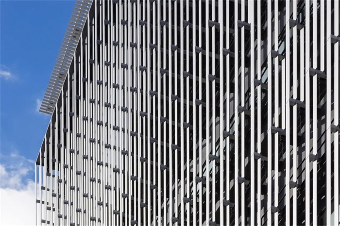 铝制翅片板的间距为1200毫米,通过2至5个片板在纵深方向的随机重叠,实现了幕墙的波动表面效果,可反射云、雾等自然现象。