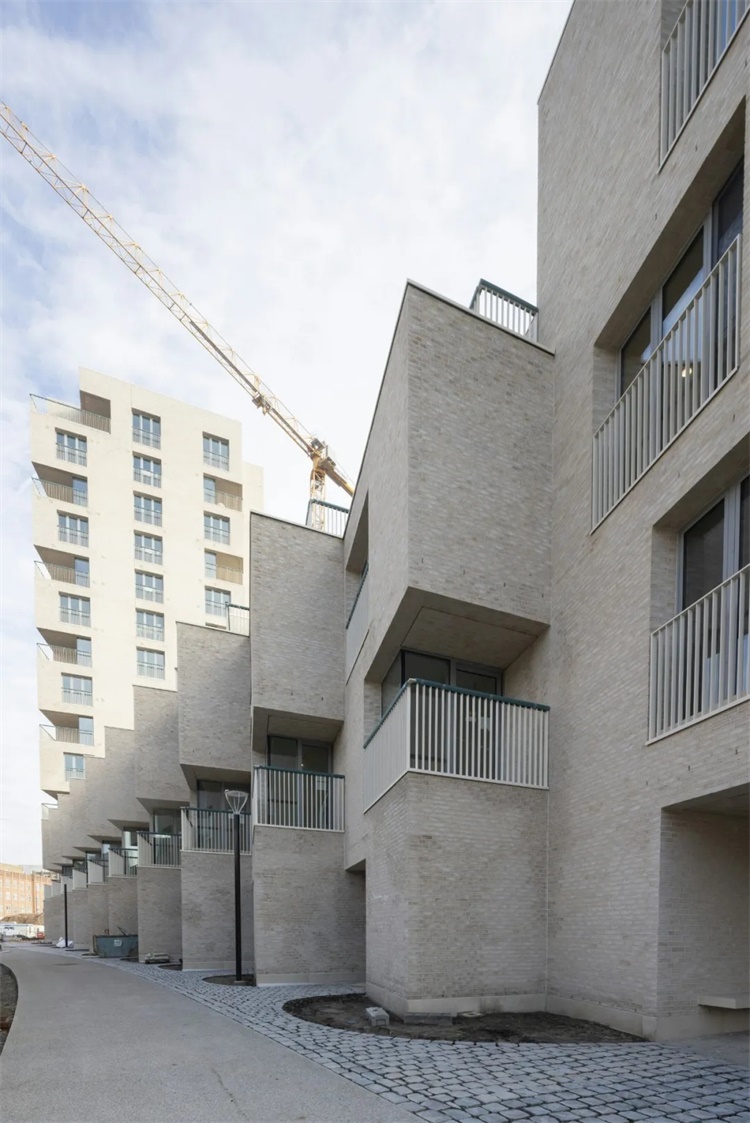 设计团队通过在整个项目中寻找一致的建筑语言,将塔楼、别墅及公寓楼融合成了一个连贯的整体,这种语言由居住单元的大小和灰色砖砌外墙的连续使用来定义。在塔楼设计中,设计团队通过上下楼层公寓阳台的镜像排列展现了每个单元的特色,使得整个建筑具有强烈的雕塑形式。