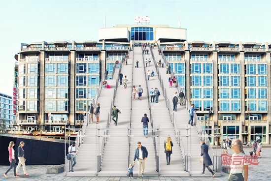 荷兰建筑设计公司MVRDV公布了一座巨型脚手架楼梯的设计方案。这座巨型楼梯从鹿特丹中央车站广场开始搭建,直达世界著名的Groot Handelsgebouw大楼顶部。整个楼梯由脚手架搭建而成,是对第二次世界大战以后鹿特丹市重建75周年的致敬。