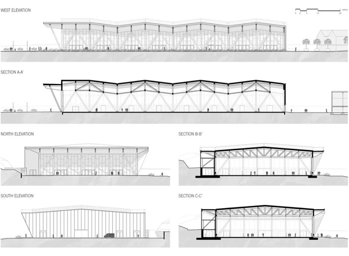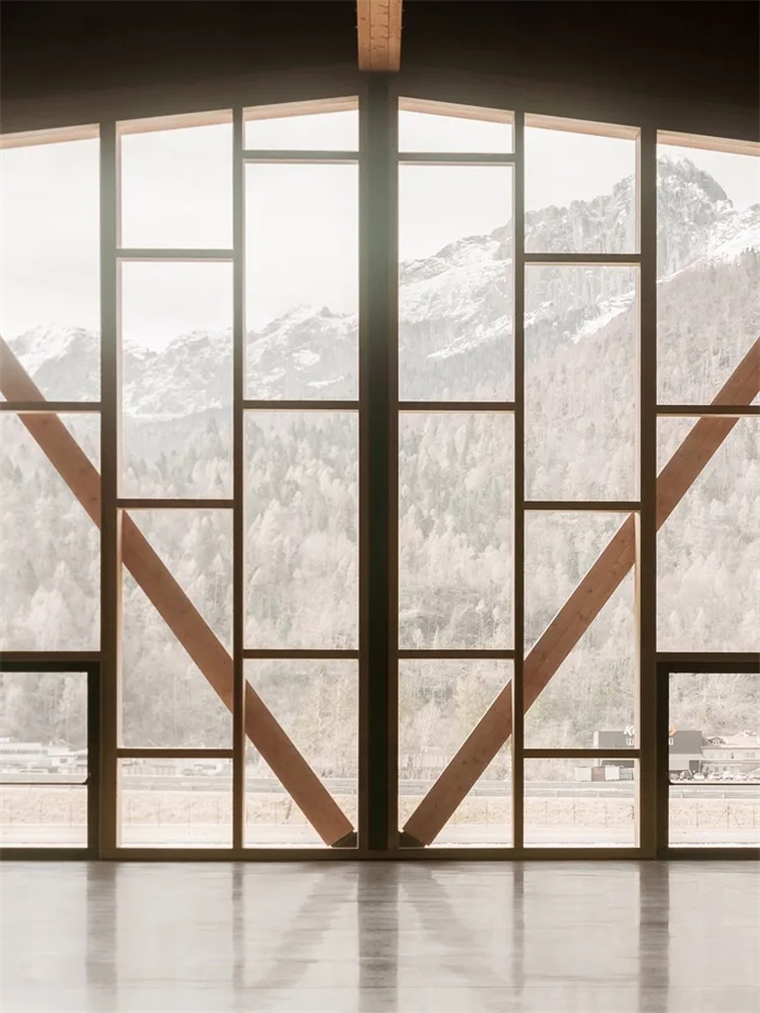建筑设计灵感来自具有木制框架和交叉支撑元素的阿尔卑斯山谷传统建筑。支撑结构采用木材构建,既具有环境兼容性,又与阿尔卑斯建筑传统保持一致。北立面和西立面被设计成面向景观的大面积透明玻璃幕墙,人们可以从建筑室内欣赏山脉。相反,东立面和南立面则相对闭塞。