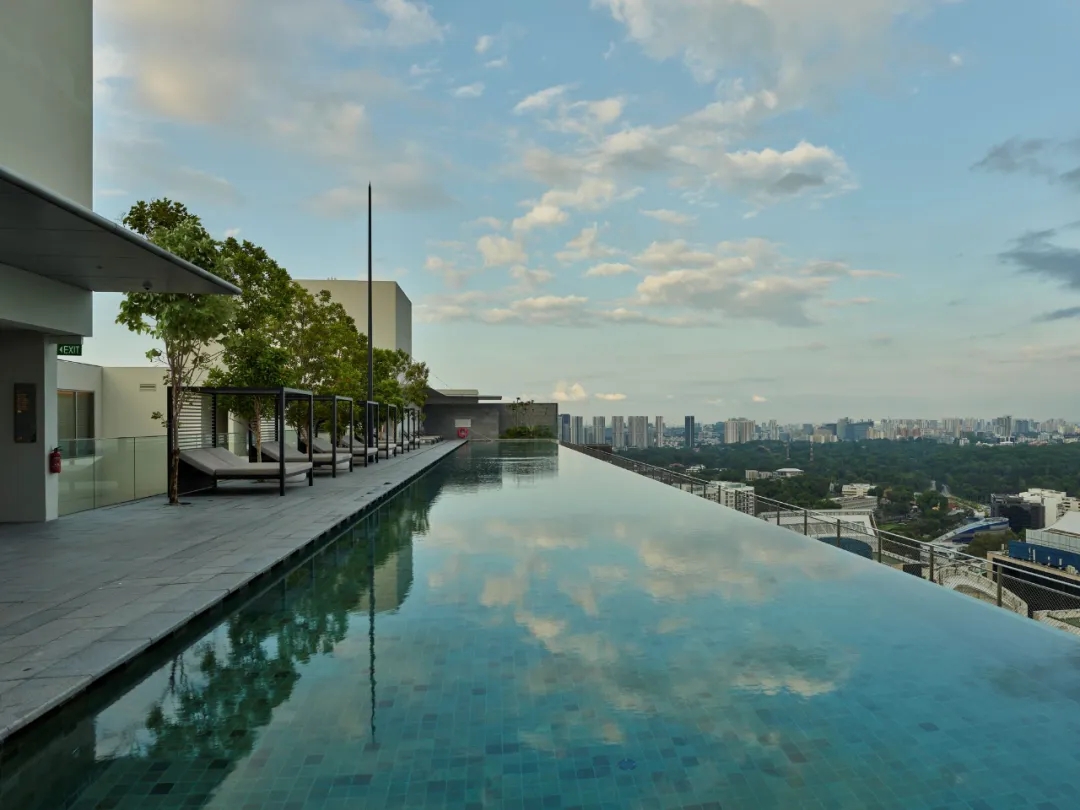 位于酒店九层的天桥,如蓝绿相间的丝带,浮现在两幢住宅塔楼之间。天桥上有43米泳池、日光甲板、户外酒吧和休息区,周遭植物丰富,枝叶茂密。客人透过泳池池底中央的亚克力透明视窗,可以尽享下方花园庭院的奇妙美景。