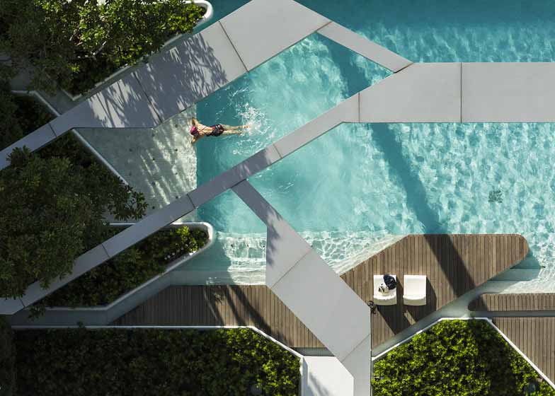 澳大利亚TROP景观事务所设计了泰国曼谷一栋住宅楼顶游泳池项目。泳池位于42层住宅综合体裙楼的楼顶,邻近曼谷市车站。由于住户和车站旅客均从上方俯瞰泳池,因此TROP事务所添加了一个混凝土框架顶棚,将泳池划分成不同区域。设计师表示,“曼谷市位于建筑楼顶的大多数泳池都被称为‘空中泳池’。起初,这一概念令人兴奋,但是数量增多后,变得没有新意”。为了使该项目区别于其他同类泳池,设计师运用一种成为“骨架”的轻型结构在三维空间覆盖了泳池。泳池的轮廓包括一系列带有圆弧拐角的直线条。设计师尽可能避免采用迟滞线条,在四周区域设置了木甲板和绿化区。