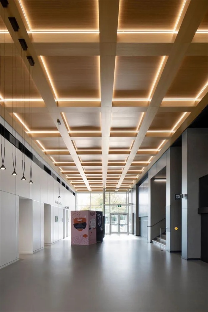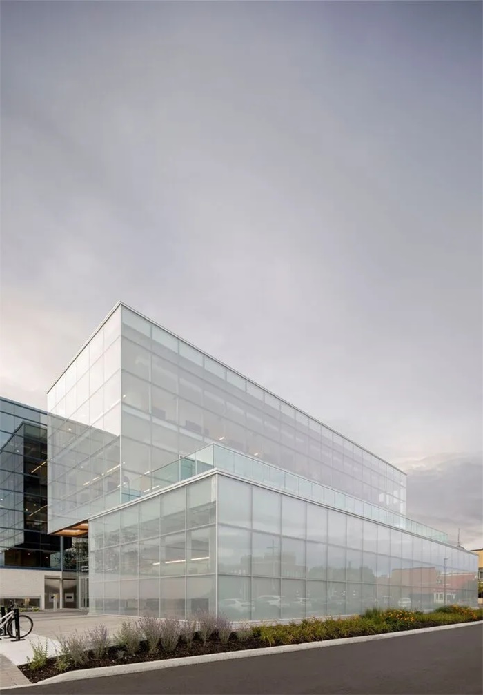 ACDF 没有拆除这座依然坚固的现有建筑,也没有替换其状况良好的建筑立面,而是提出了一种结合实用主义和创造力的双重思维模式。扩建部分包裹着一层白色的玻璃外皮,在夜晚的景观中犹如一座灯塔,它巧妙地与现有建筑区分开来,同时又不显得突兀。其体量简洁、玻璃外皮与现有建筑的模块相似,共同构成了一个和谐的整体。结果是一个均衡的融合体,它见证了最初追求的建筑集约化,并负责任地应对了当今世界面临的环境挑战。