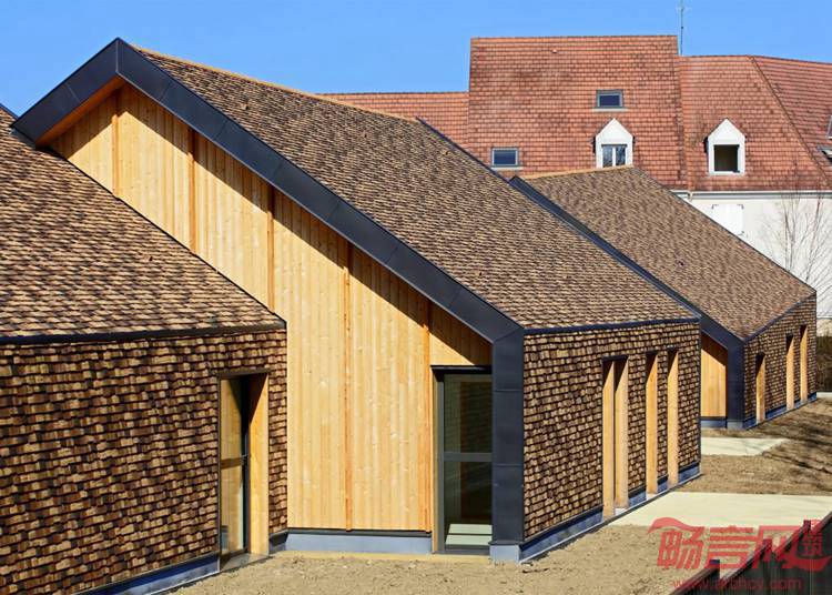 Nomade工作室设计了巴黎郊外的幼儿园。建筑外墙和屋面覆盖了大地色的瓷砖,山形墙外的墙砖构成护墙板的构造。幼儿园位于巴黎东南35公里的Lieusaint,介于市中心和住宅区之间。设计目标是为家长和儿童营造社交空间,并创造幼儿专属区域,设计是基于创造小型村庄的概念。七座山形墙建筑围绕中央庭院而设。长长的立面和高耸的屋面覆盖了黑色和浅棕色瓷砖,和周边自然景观融为一体。