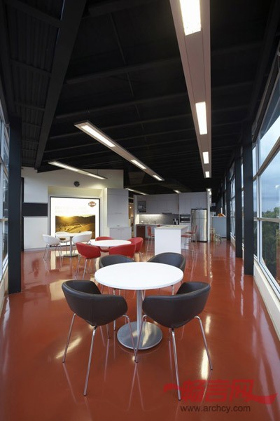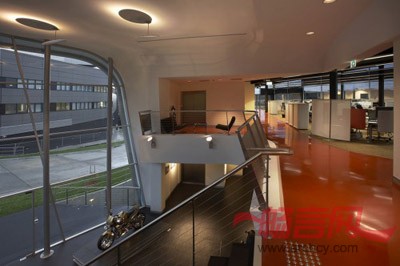从该建筑的中层楼,可以看到所有反映Harley员工工作和生活方式的空间:陈列室、咖啡厅、图书馆,甚至体育馆。