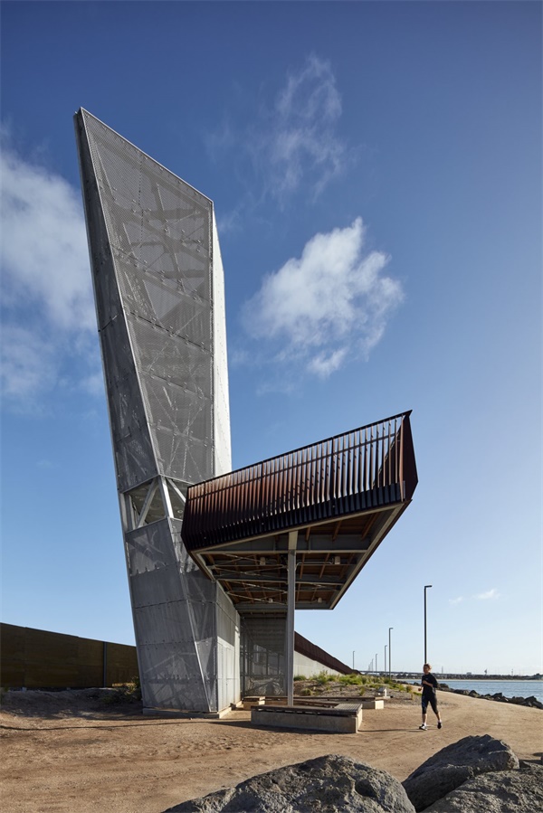 受周边环境启发,瞭望塔倾斜的棱角形式来自重建的沙丘景观,其实体反映了海上、港口基础设施的强劲活力。硬木甲板、耐候钢和镀锌钢的克制色调,使观景平台和塔在一个由巨型集装箱起重机主导的体系中,呈现出朴素、自然的观感。