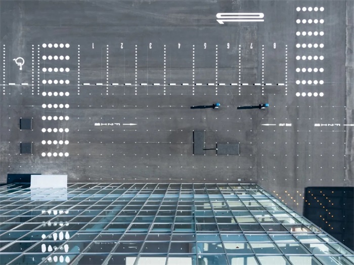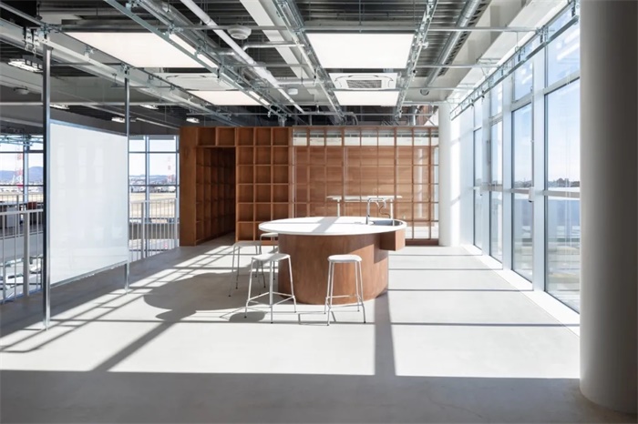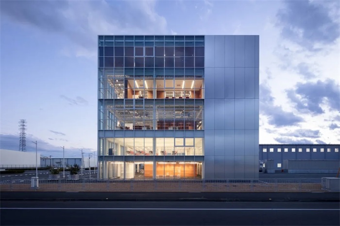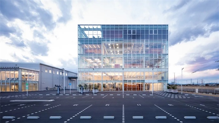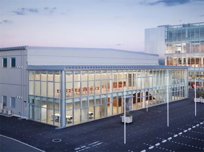 场地是一个约2万平方米的大型平地,四周环绕着道路。停车场和外部区域铺设了沥青,而不是建造栅栏或墙壁来分隔场地的内外,以便它们与周围区域连续。此外,还使用了与普通道路标志相匹配的标识来连接场地的内部和外部。同时设计团队将停车场、标志和路面标识交织成一个平面设计网格,建立了一个将建筑物和外部相互关联的网格图形系统。而用于工厂和办公室结构的网格和玻璃幕墙与外部图形相互交织在一起。