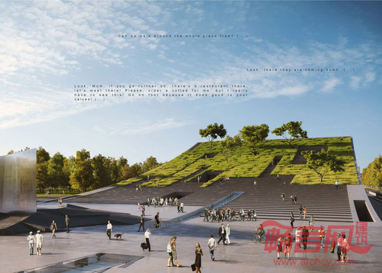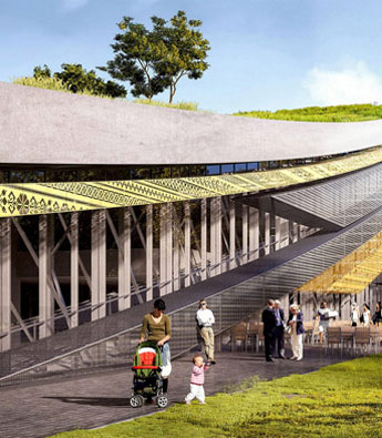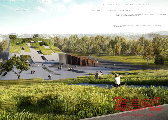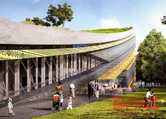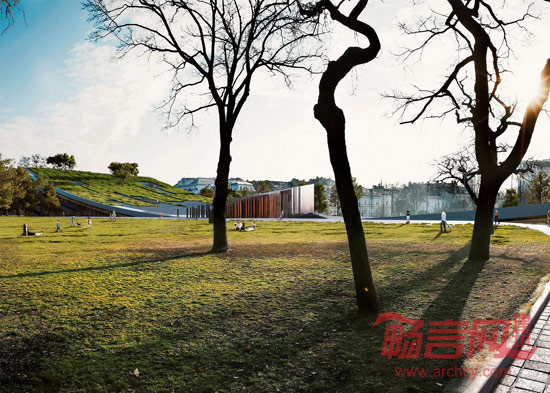 这座博物馆被称为“城市公园之门”,其建筑外形酷似一个巨型滑板,屋顶有草皮覆盖。“滑板”的两端将多层展厅,中间则是宽敞的开放区域,此外,绿色屋顶也可以作为新的公共集会场所。