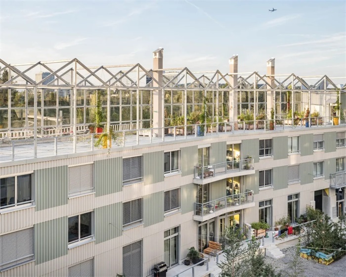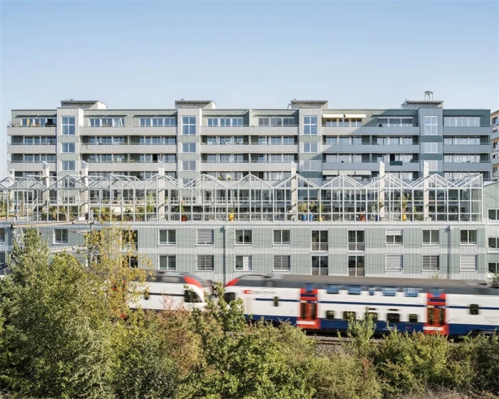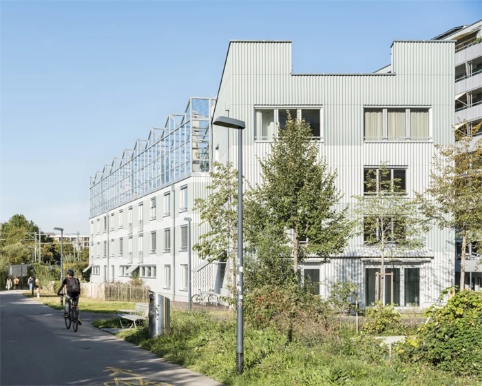 Westhof Dübendorf 项目坐落在苏黎世迪本多夫小镇 Hochbord 区域铁路沿线的一个植物苗圃地块上。项目所在的这片地区曾是工业和商业区,由于被重新划分为了住宅区,正在进行重大的结构调整。该合作建房项目基于场地作为植物苗圃的历史,利用其互补性的公共用途创造了一个具有身份认同的场所,培养了强烈的社区意识和生态联系。其建筑语言简洁有力,与原有建筑的功能性相呼应,同时毗邻自然保护区,加强了与该地区生态圈的联系。