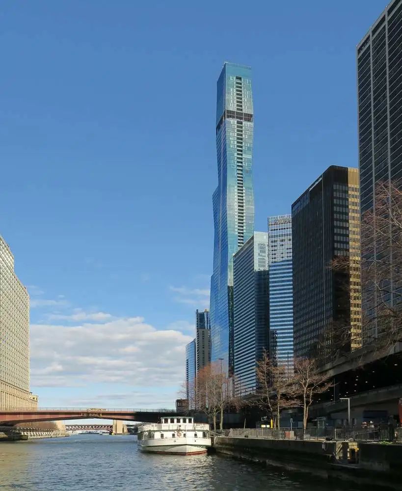 塔楼坐落在芝加哥市中心湖岸东公园和河滨步道之间,是一座有通透底层的超高层建筑,行人可以自由穿梭。项目旨在增强而不是破坏其周围的城市结构。作为城市地标之一,流动的形体是这座大楼的最大特色,棱台形的单元组成的凹进突出的立面有着特别的韵律。