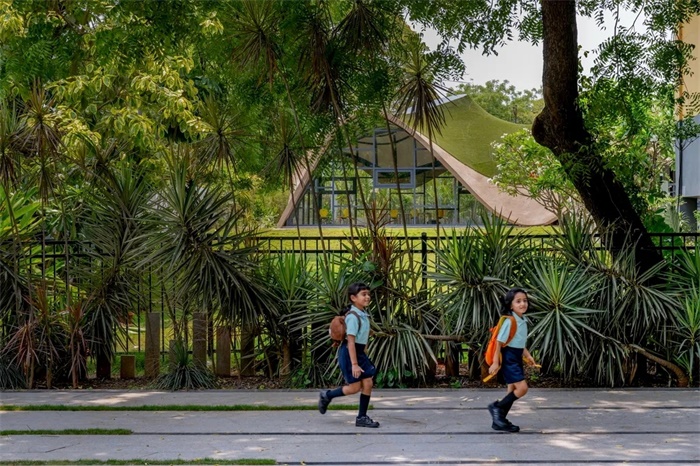 项目由andblack design studio设计,位于印度维杰亚瓦达,占地4000平方英尺,屋顶的流线形态覆盖着草皮,安置在一个没有任何内部支撑或隔断的开阔结构空间之上,通过将建筑形态、景观和室内设计融合为一个整体,重新定义了学校的概念。