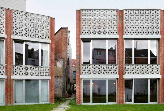 Collectief Noord建筑事务所在比利时安特卫普市中心设计了由三座住宅和一座办公室组成的混合型项目。每座住宅外观类似,略有不同。混凝土格栅外立面的住宅具有传统花园装饰性建筑特点。每座住宅设有顶部附加建筑,构成“园中园”构造。