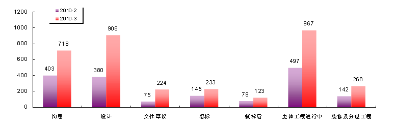RCC数据监测系统显示:3月份所报道项目数量远远超过上月的报道量,尤其是处于设计、主体工程进行中和构思阶段的项目,增长量最大;据RCC监测数据分析可知:住宅项目依然是3月份国内工程项目的重点项目类型,无论是所报道住宅项目数量还是住宅项目造价,均明显高于其它类型项目,如下图所示: