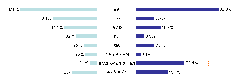 注:左图中基础设施类项目包括基础建设和公用事业设施两类项目;由于基础建设和公用事业设施类项目无法按建筑面积统计,因此右图中RCC所报道的建筑面积不含这两类项目;