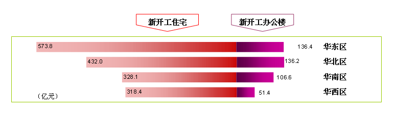 本月新开工项目的区域分布情况,住宅项目方面,华东地区的开工规模远远高于其他区域,其次为华北区,华南、华西地区住宅项目开工规模则较为接近;办公楼项目方面,华东区和华北区依然是最主要的开工区域,且开工规模十分接近。