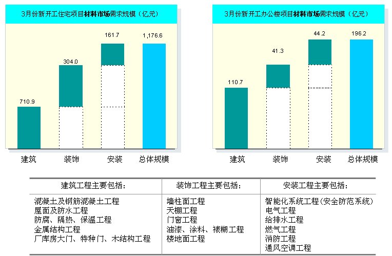 3月份住宅类新开工项目造价和办公楼项目造价均有一定幅度的增长。根据RCC“工程市场规模测算模型”的计算结果,预计本月新开工住宅类项目带动的下游材料需求规模在人民币1,176.6亿元左右,预计新开工的办公楼项目带动的下游材料需求规模在人民币196.2亿元左右(均不含人工费)。