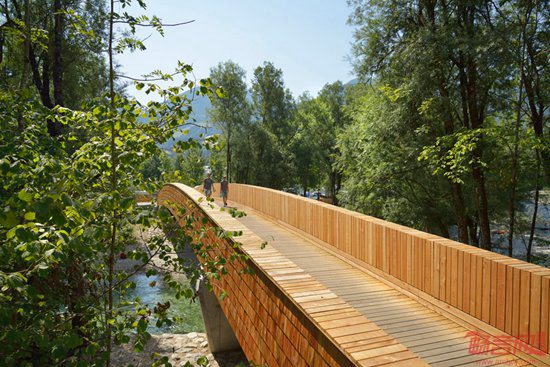 DANS建筑事务所利用木板材和护墙板营造了位于斯洛文尼亚的步行桥和自行车道路,将一座村庄和附近的湖泊山峰连接起来。桥梁立于Sava河上方,长达54米,是一个Bohinjska村自行车道路的一部分,终结于Bohinj湖。设计师表示,桥梁通过搭建一条前所未有的路径,营造了新的空间关系。虽然听上去简单,桥梁却触及到多种层面上的意义,因而桥梁在历史上对人们有着特殊重要性。