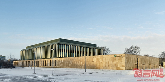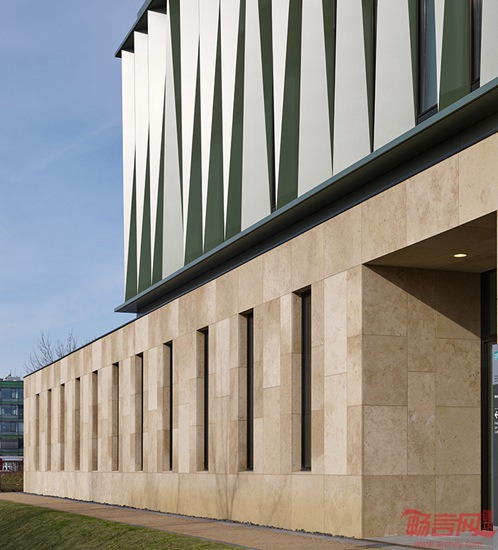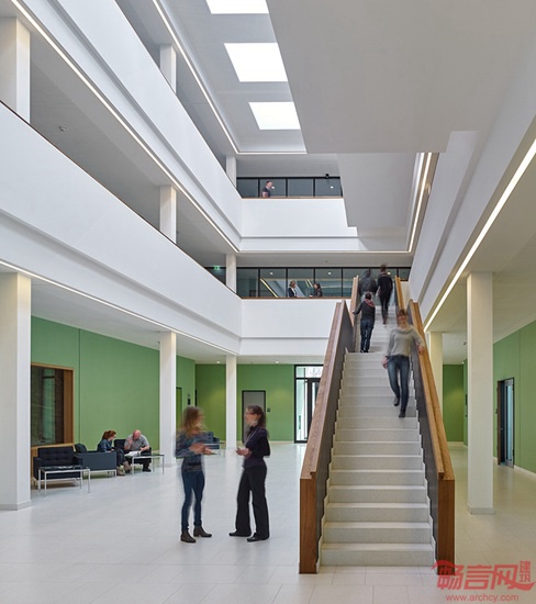 Mueller Reimann建筑事务所设计了位于德国吕贝克的Fraunhofer海洋生物研究院建筑。这是一个科研设施,在背景环境中展现出醒目的结构形式。浅色基座之上设有坚实的Alucobond 铝复合板结构。这一材料元素成为外立面的焦点,表现出活跃的韵律。建筑内部设有光线明亮的中庭,配合海蓝色涂料,赋予空间轻盈感。开放式楼梯提供所有楼层的可达性,中庭自身也成为周围会议室的休息区。