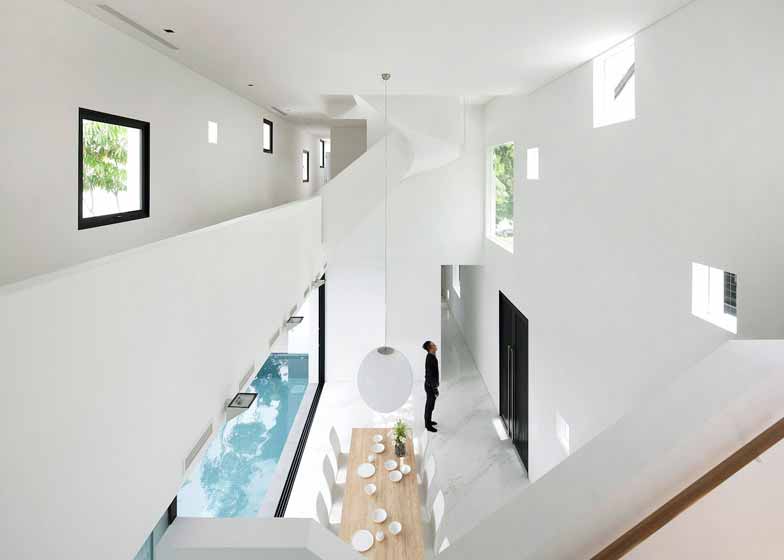 最终的设计效果中,三层住宅和一层地下室总建筑面积达到500平方米。住宅从前到后都有间隙,降低了视觉密度,提升了通风效果,赋予每座住宅俯瞰下方花园的机会。