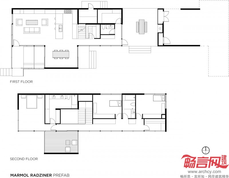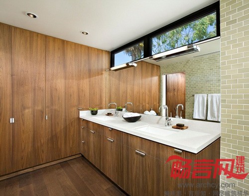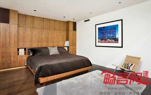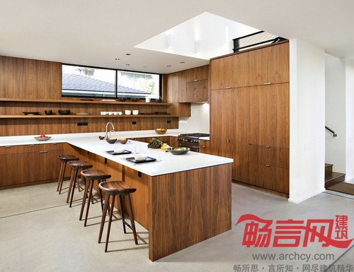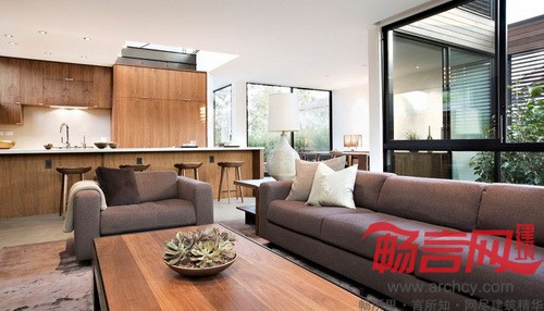 “房子建筑面积为2800平方英尺,分为14个模块区域,其中包括3间卧室、2间浴室、1间起居室、1间餐厅和1间厨房。厨房是双层挑高设计的,而且顶部的天窗还可以打开,”设计师说:“此外,屋内还设有一间办公室,室外还有一个700平方英尺的活动区。房子的南面安装了巨大的玻璃门窗,这样就保证了屋内充足的自然光线,而且也能将室内外空间很好地结合起来。”