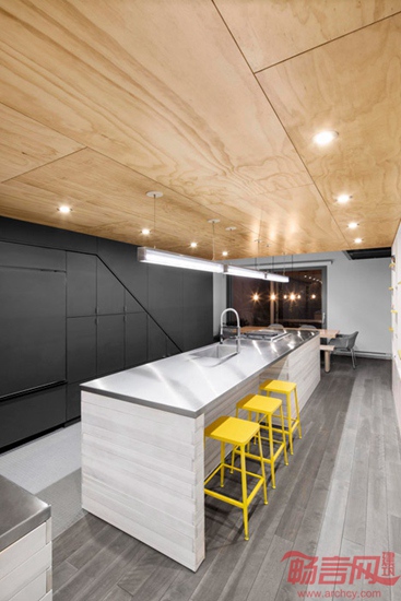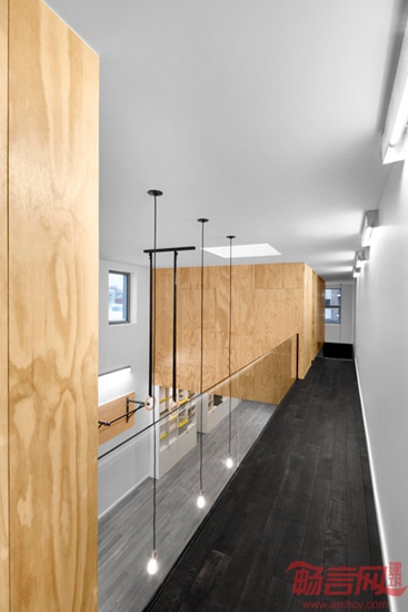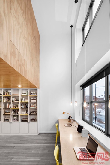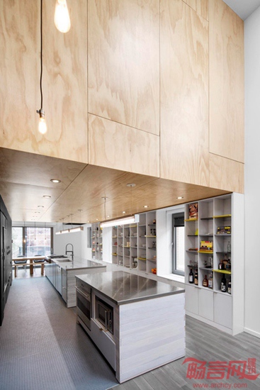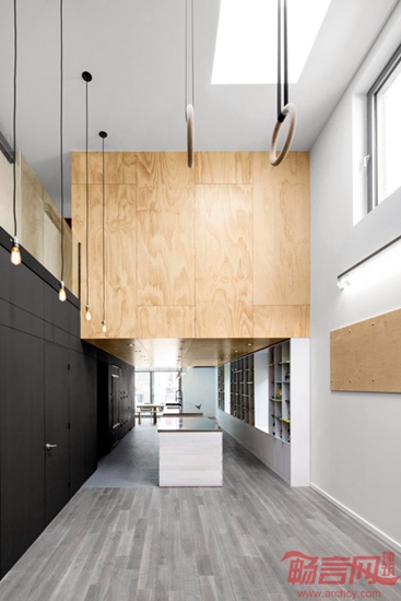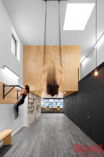 Naturehumaine建筑事务所设计了蒙特利尔体操选手住宅。项目是一套翻新住宅。根据业主职业特点,设计师在住宅天花上安装了体操吊环。设计师被委托对Cote des Neiges路的一座建筑最高两层进行翻新。项目去除了分隔两层的楼面,营造了双倍层高的空间,中央悬吊了一个巨大的胶合板方形结构,将项目命名为“悬浮”住宅。