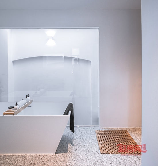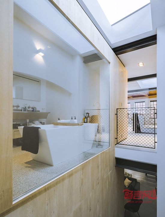 浴室、卫生间、储藏室和厨房这些功能元素被安排在了一个巨大的木质结构中,这个木质结构与上下楼相接。通过孔洞,从浴室里可以看到头顶的天空。
