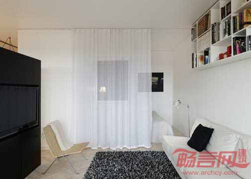 卧室区域被轻薄的窗帘隔开,使大扇窗户的光线能够穿透,进入空间内。