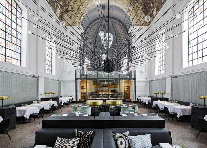 设计师Piet Boon将比利时安特卫普一座军队医院教堂的室内进行装饰,转变成具有雕塑吊灯的当代风格餐厅。设计师同PSLAB照明设计公司合作,设计了The Jane餐厅室内部分,将现代元素同教堂高屋顶和图案地砖结合起来。设计师透露,“我们保留的主要元素是教堂天花以及原有的陶瓷地砖。我们将项目形容成‘精致餐厅遇上摇滚乐’,餐厅将厨房同教堂原有圣坛相结合。”PSLAB设计的吊灯采用不锈钢和手工制作的水晶玻璃,成为餐厅中央设计元素。纤细的钢柱向个方向伸出,末端镶嵌了细小的水晶圆球。