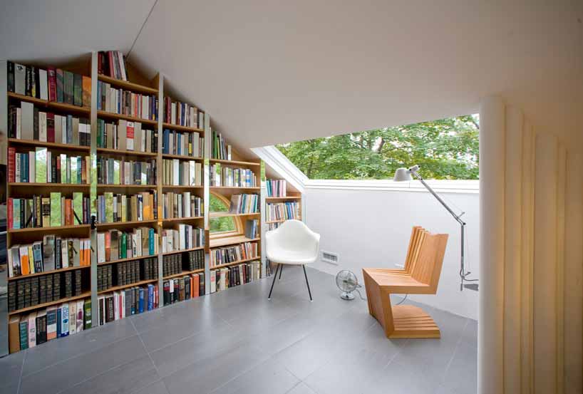 PARA Project公司将纽约一座阁楼改造成光线充裕的书房和客房,营造出宛如都市隐居地的氛围。项目名为“Crawford阁楼书房”,业主夫妇分别是作家和装订商,要求拥有用于写作和存放大量书籍藏品的空间。项目采用开放式设计,划分出若干区域。重要交通路径环绕空间中央,充分利用了挑高屋面。斜坡屋面较低位置容纳了写作区,分别设有书桌、座椅、沙发椅和猫脚浴缸。客房套间设有无框后窗,另外一端是书架。