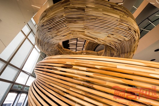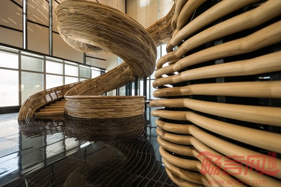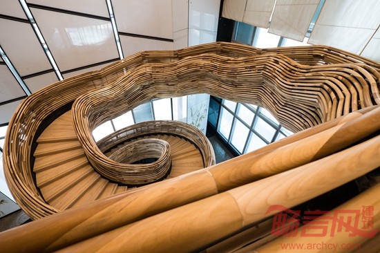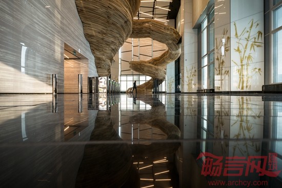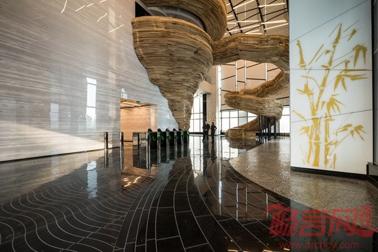 因其独特的大厅设计,大厦被命名为Atrium(中庭)大厦。大厅由建筑师Oded Halaf设计,方正的大厅由玻璃围起来,有4层楼高。大厅内的楼梯别具特色,其以金属楼梯框架为基础,外面包裹着雕塑般的木材装饰,整个楼梯像龙卷风一样从前台位置盘旋而上。