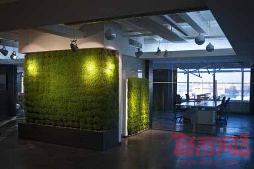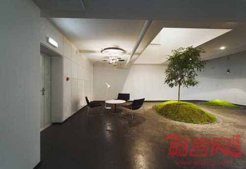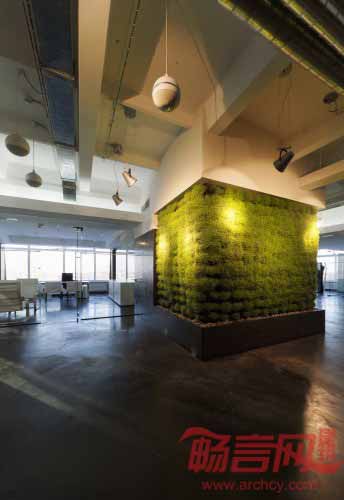 设计师表达“新生命”的形式主要是在空间各个平面上添加五花八门的绿色元素——靠近接待台的垂直绿色立柱、办公室中心区域的绿色立方体、入口处的绿色篱笆、金属格栅中的灌木植物、混凝土地面上生长的绿树小山以及屋顶的绿色林地。