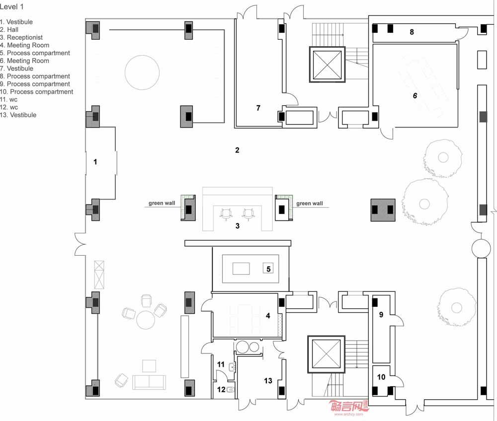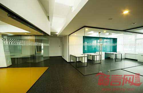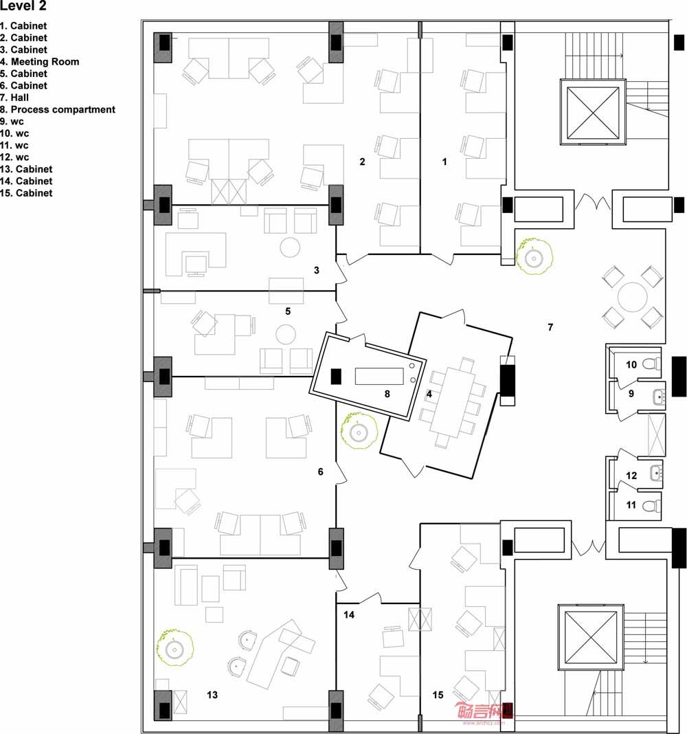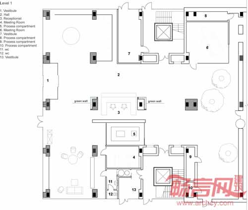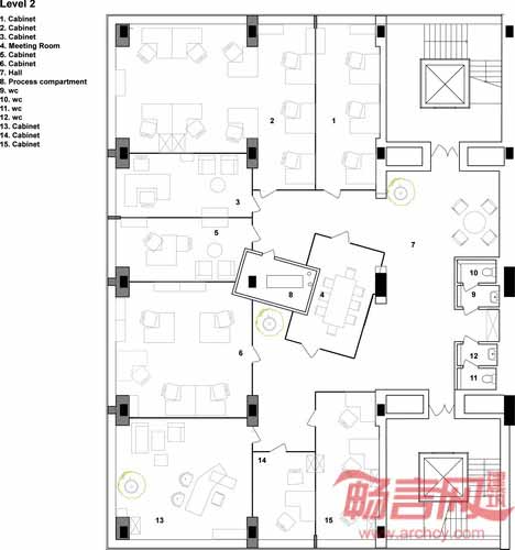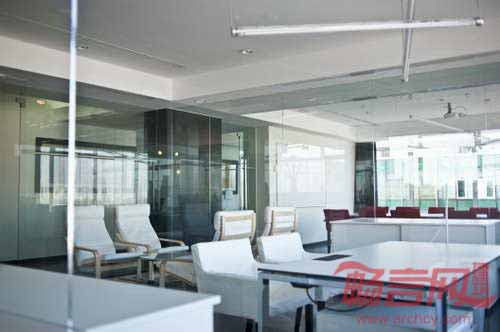 办公室布局采用了开敞式,不同工作间之间采取了玻璃隔断,因而保证了良好的通风条件,办公家具构成了沉静冷峻的背景。办公室屋顶部分保持了长条板的形式,部分被管线或其他设施切断,最终屋顶变成了木质起伏结构并与植物平台连接。此外,来宾区可用作电影厅和培训室。
