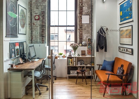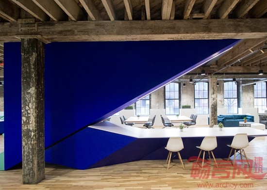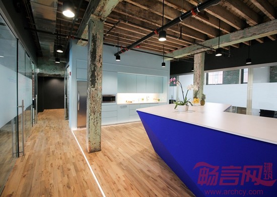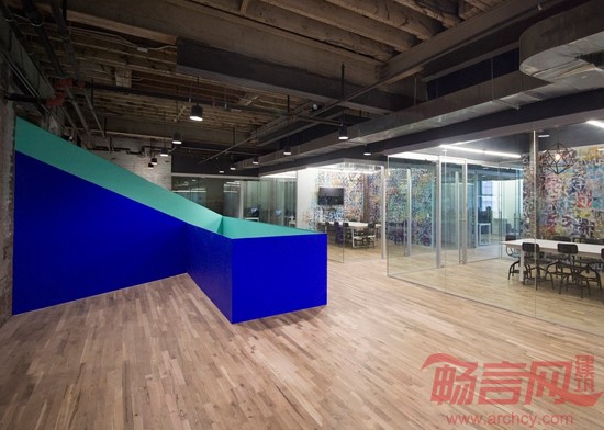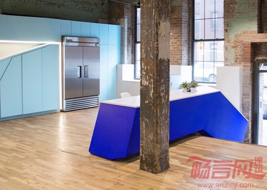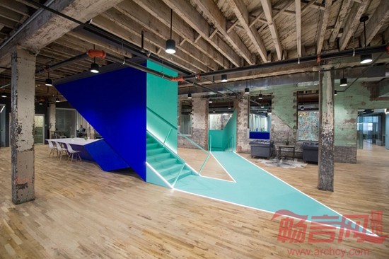 通过引入一个呈锐角的彩色楼梯井,纽约Leeser Architechture将位于布鲁克林的旧工厂改造成了一个充满活力的联合办公工作室,供富有创造力的职业人士和企业家们使用。