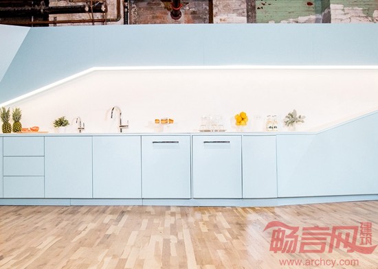 楼梯井呈锐角结构,颜色鲜艳,外表面为蓝色,内表面为青绿色。在楼梯背面——这部分空间对于一般楼梯井而言通常是浪费的——而这里设计了一个大公用桌台。