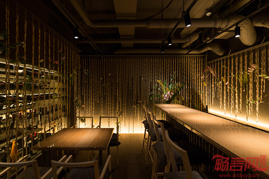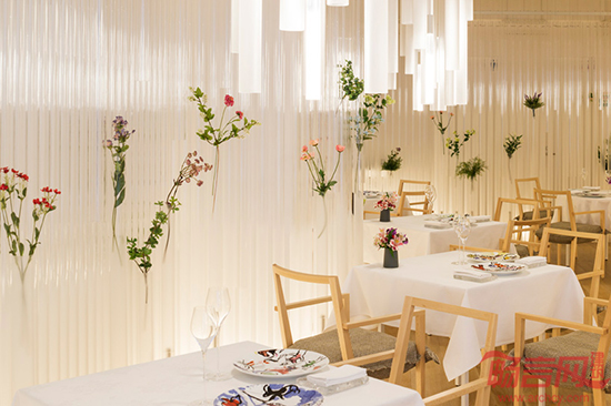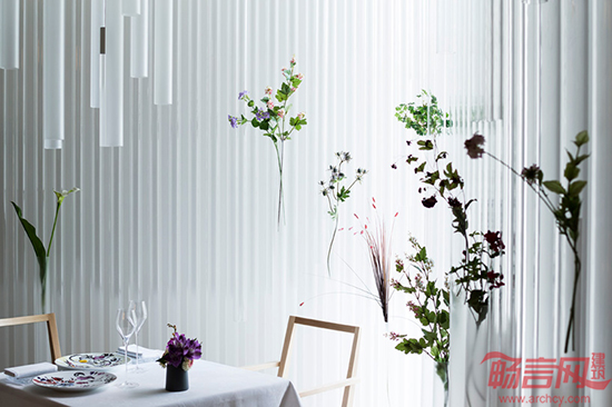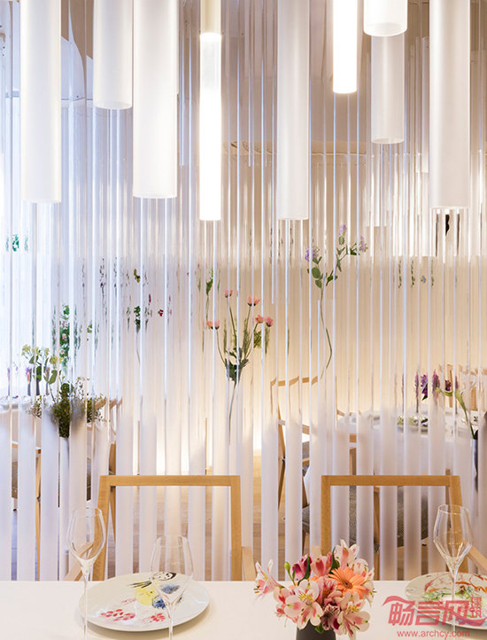 这间餐厅名为Nacree,其室内设计中引人注目的焦点是这样一些非同寻常的建筑元素:丙烯酸透明管从天花板上垂下来,将餐厅分成多个不同的区域。这样不仅起到了分隔区域和扩散灯光的功能性作用,还起到了插花等装饰性作用。