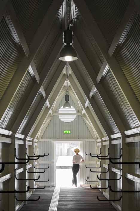Beleem Lima建筑事务所在Belem Lima北部Bagauste大坝马路的两端设立了两个小屋,分别作为公共船库和咖啡厅。由于前往附近Douro峡谷酒庄必须经过大坝,船库和咖啡厅的设立为日渐增多的游客提供了便利。尽管该地点在夏季已经启用,但是设施十分陈旧。Lamego市市长因此建议新建一座码头、库房和存放独木舟的船库。单层大屋具有高耸的尖屋顶,其外墙覆盖了铝合金板材。餐厅酒吧功能的小屋内设有桌椅,就餐区延伸到有顶棚的室外区域。