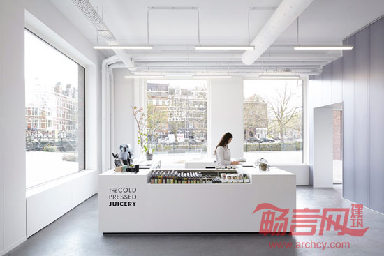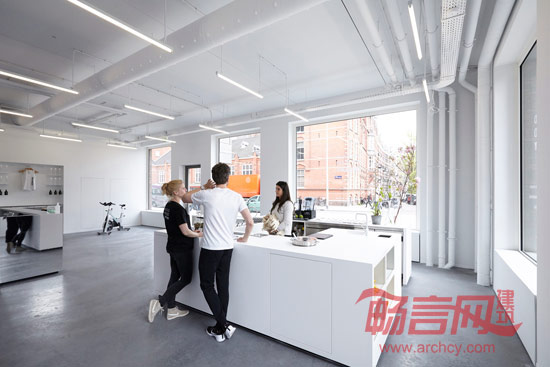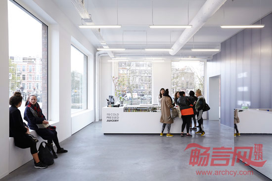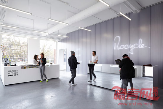 XML设计的Rocycle健身房旗舰店标志着“运动休闲”的健身房理念被首次引入荷兰。大厅内有一道半透明的墙,墙上显示着可变化的LED文字。一间男女皆宜的更衣室很方便客人在课间更换服装。大厅也被用作主要社交场所,透过巨大的窗户,从这里可以欣赏阿姆斯特丹运河的景色。