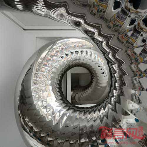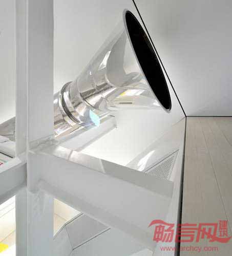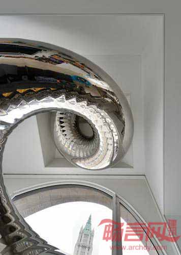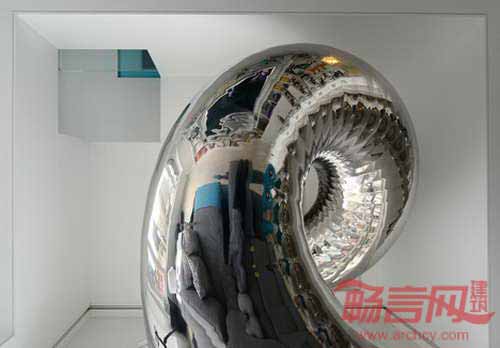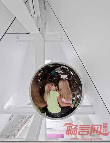 钢质滑梯从建筑顶部的玻璃阁楼开始,并被纳入一个环形孔洞中,住户可以安全钻入并滑下。