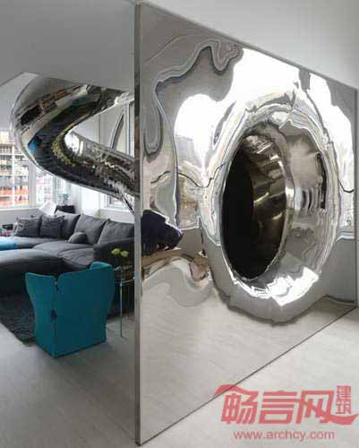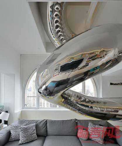 建筑师David Hotson设计了位于纽约的一套复式公寓,其特征是拥有一个从四层自上而下的管状滑梯。