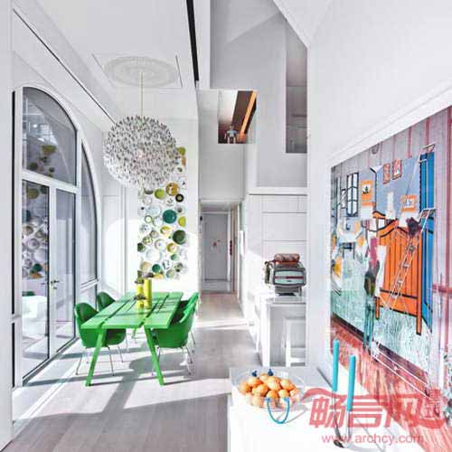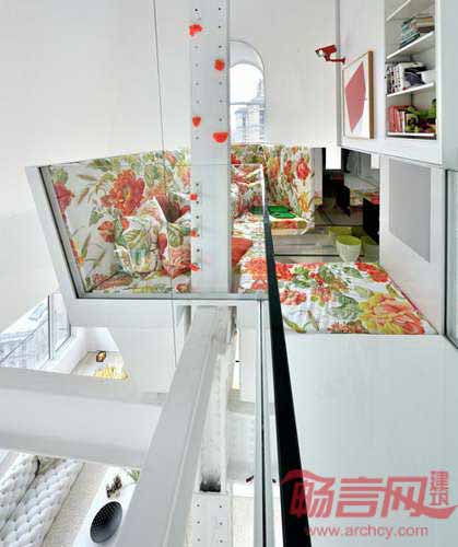公寓位于下曼哈顿区一栋19世纪建筑的较高楼层,以前未被用作住宅,建筑师David Hotson改造了整个空间,赋予公寓四倍层高的起居室、透明阁楼、室内阳台和滑梯。