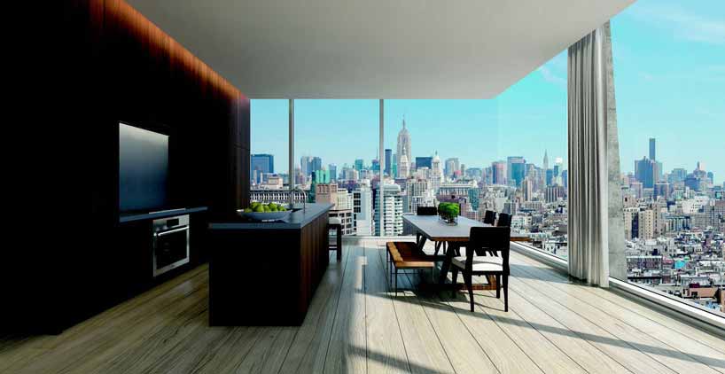 Chrystie大街215号位于纽约发展迅速的Bowery区。项目由Ian Schrager房地产公司开发,涵盖酒店和住宅单元。建筑和室内设计分别由Herzog & de Meuron建筑事务所和英国设计师John Pawson担当。建筑表现出赋有活力的外部框架,室内采用无柱处理,展现出开敞的楼面设计。落地玻璃幕墙、大扇玻璃窗实现了布局空旷,视野广阔的效果。