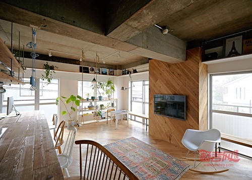 通过剥去室内墙皮,露出了天花板上的混凝土横梁,另外,所有室内隔墙也被拆除。这样,就形成了一个可以用了做饭、用餐、工作和休息的灵活大空间。